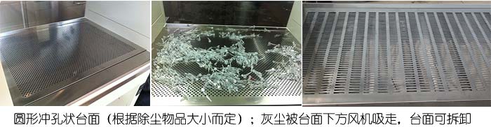 (1)上部吹风,下部吸风,整体采用内部循环的形式;即吹落的灰尘被台面下方的初效过滤袋吸收,经过台面下方的风机加压,直接送到顶部的风机静压箱内,形成内部循环;