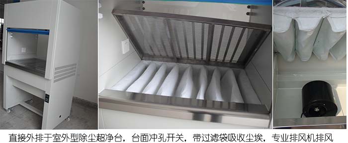 (3)上部吹风,下部吸风,接管道排于室外;通常由于此类空气有一定的异味或者不希望直接排放于室内,我们在超净台的左右侧或后部做成圆形法兰形式,外接管道可直接排于室外。在外墙上是否需要接排风机将根据设备管道的长远,如果长度在1.5米以内,不需要接管道,直接外排即可,相反,如果管道较长,为了提高排风的效果,通常需要在外墙上接排风管道;