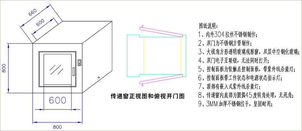 ⒈短距离传递窗工作台面采用不锈钢板,平整光洁耐磨