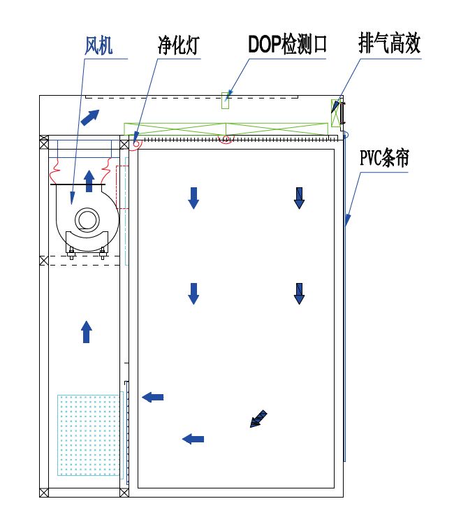 本设备采用垂直单向流的气流形式,回风先要通过初效过滤器进行预过滤,将气流中的大颗粒粉尘粒子处理掉,。经过预处理后的空气,再经过中效过滤器进行二次过滤,以起到充分保护过滤器的作用。在离心风机提供的压力下,通过过滤器,使之达到洁净要求。洁净气流被送至送风箱体内,90%通过均流送风网板,形成均匀的垂直送风气流,10%则通过风量调节板,排出设备。所有气流均经过过滤器处理,所以送风,排风均不带残余粉尘,避免了二次污染。由于在工作区域形成稳定的单向流,在此区域中散发的粉尘,会在单向气流的影响下,随着气流而被初、中效过滤器所捕集。设备带有10%的排风,从而形成相对与外部环境的负压,从一定程度上保证了此区域内的粉尘不会扩散至室外,起到保护外部环境的作用。