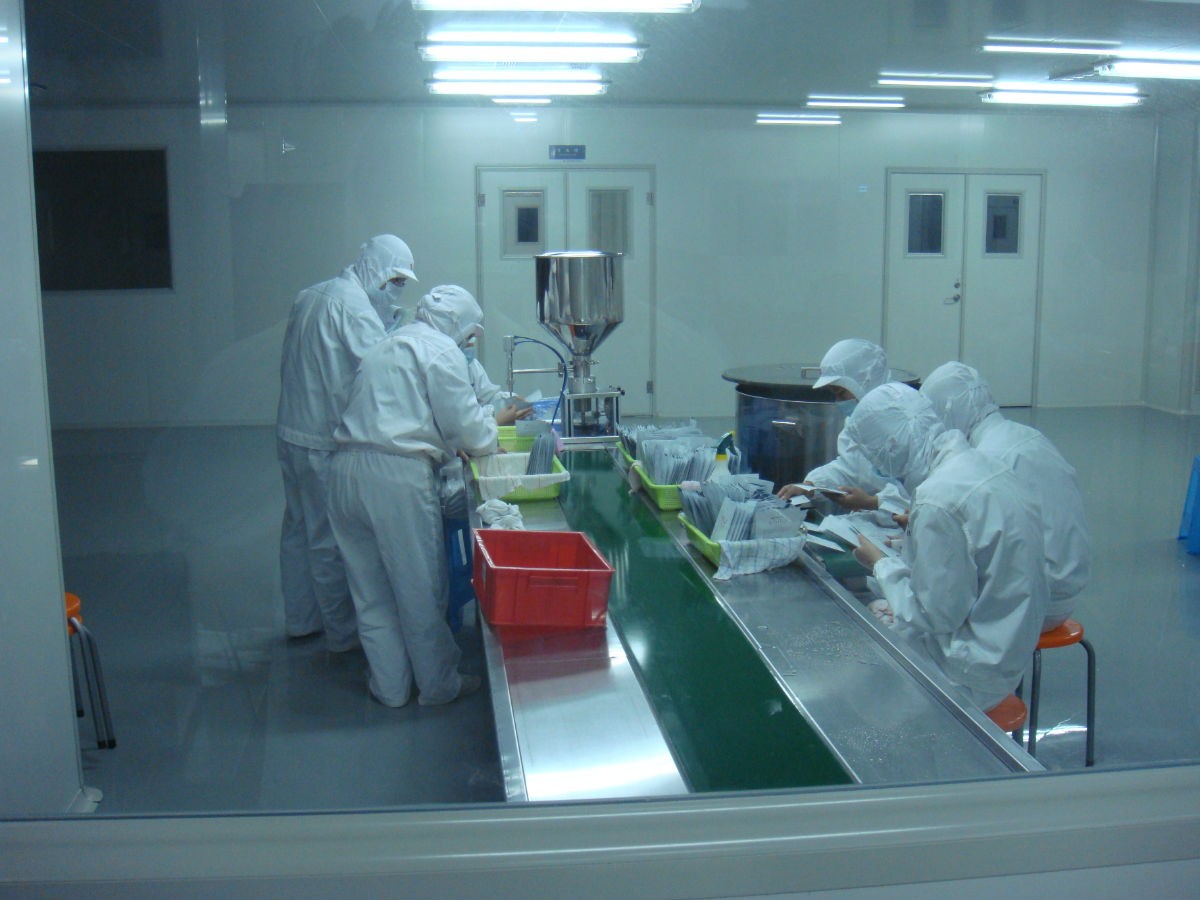 1.净化车间墙、顶板材料一般采用50mm厚的夹芯彩钢板、化妆品车间专用的氧化铝型材制造。门采用净化密闭门,窗采用铝合金玻璃固定窗。