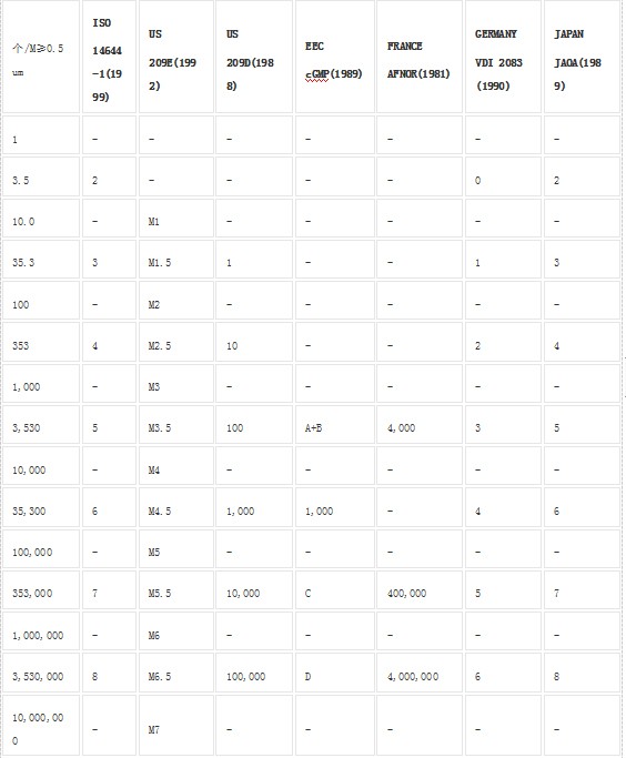 空气洁净度等级各国洁净度等级近似对照表: