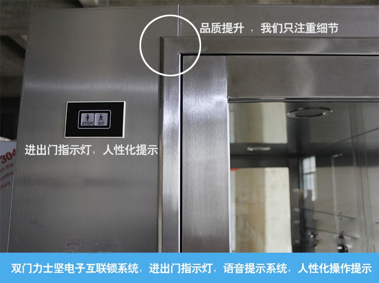 15. 双门电子联锁:风淋时两扇门同时闭锁,时间未到无法打开,保障强制员工吹淋;平时电子互锁,只可打开其中的一扇门;双门电锁为中国电控锁”力士坚LCJ“EC200型号阴级电插锁,数量:2副;